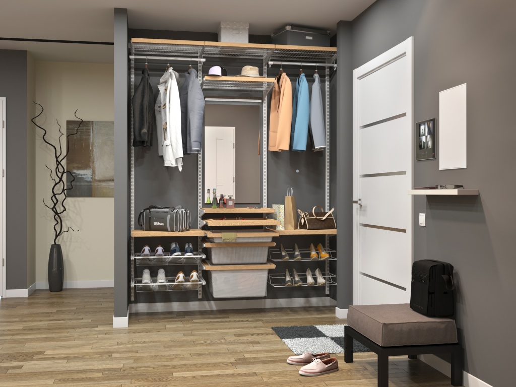 Конструкция: прямоугольный каркас, состоящий из вертикальных стоек и горизонтальных полок. Может включать одну или несколько штанг для плечиков, отдельные отсеки для обуви, корзины или ящики (часто тоже открытые)