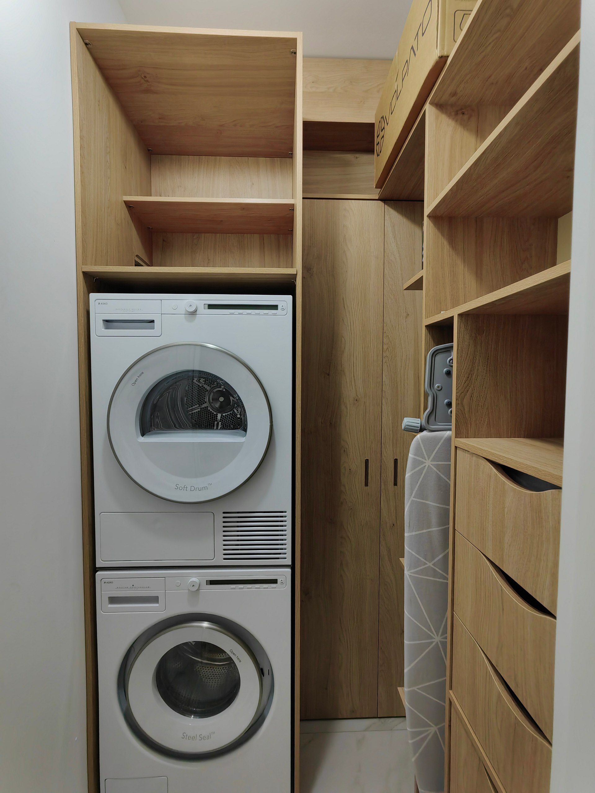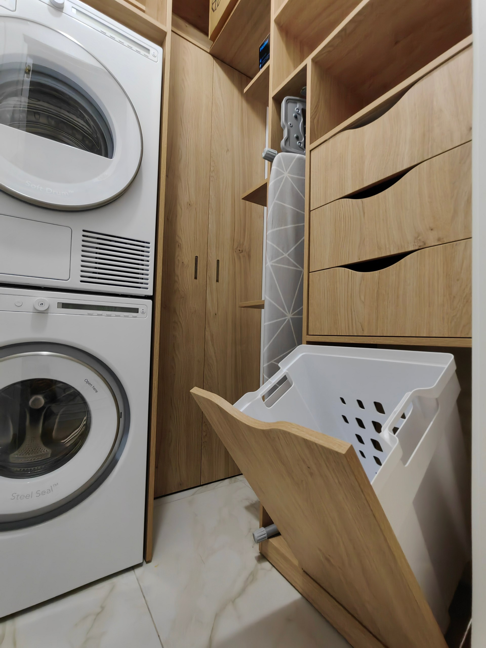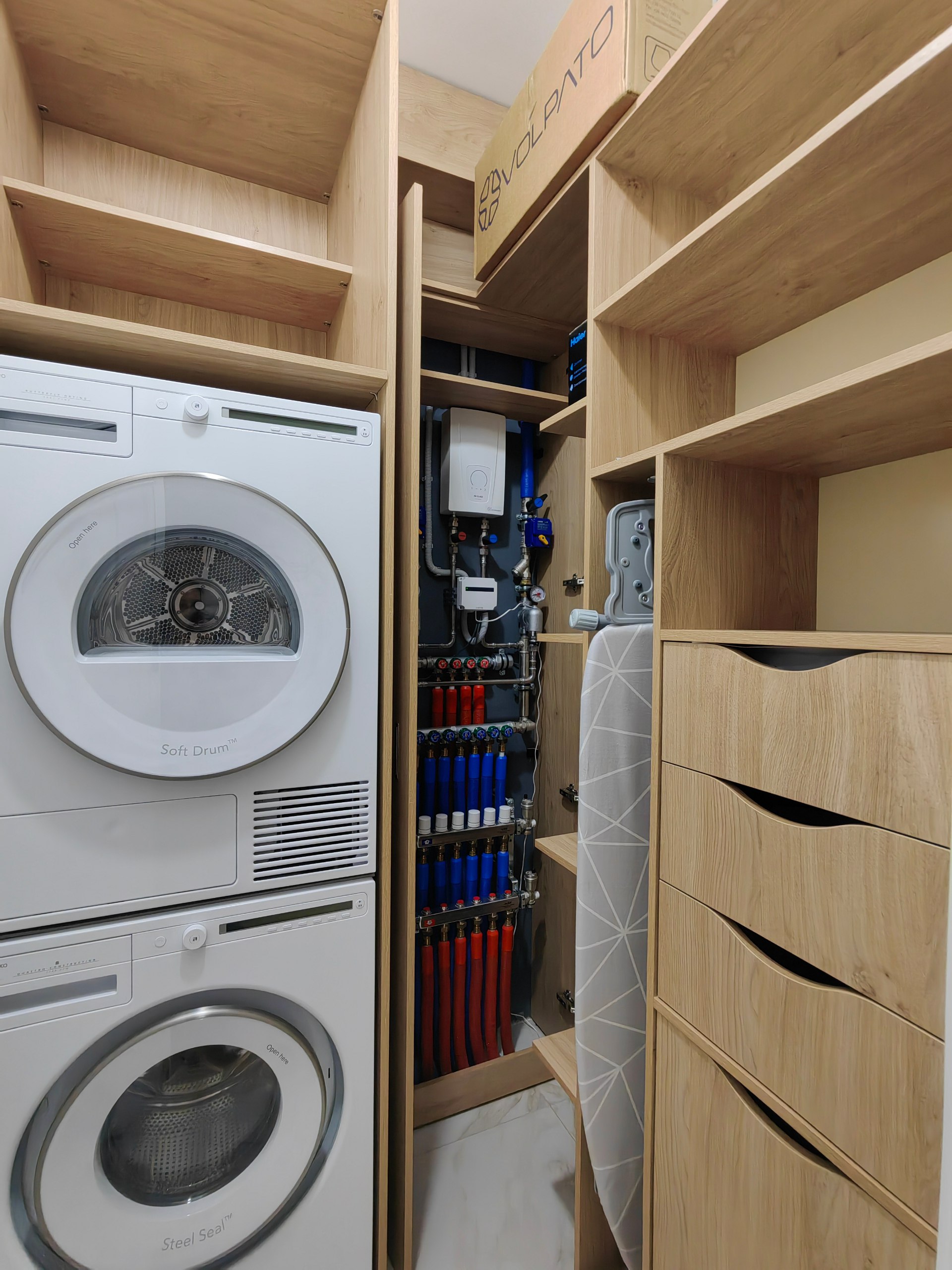 Встроенная система хранения для стиральной и сушильной машины. Такой подход особенно популярен в небольших квартирах или домах, где важно рационально использовать каждый метр