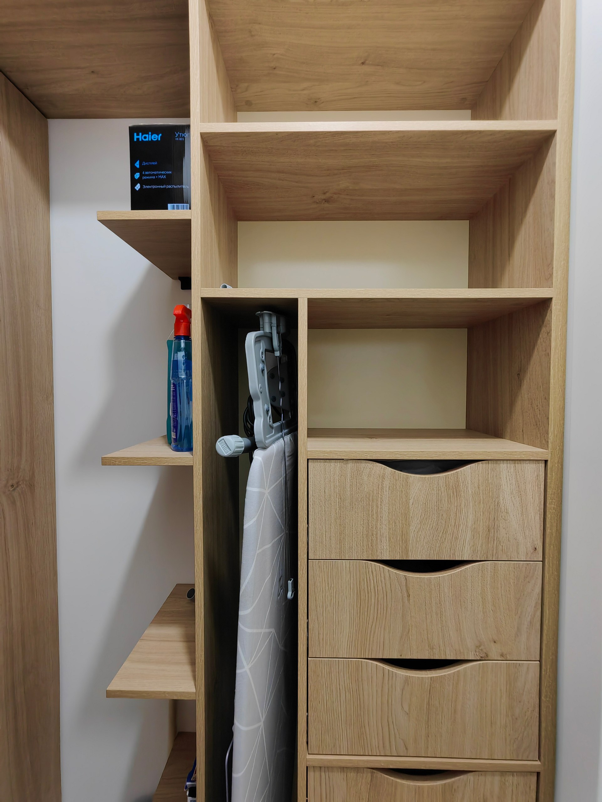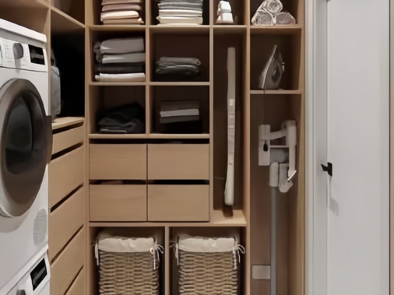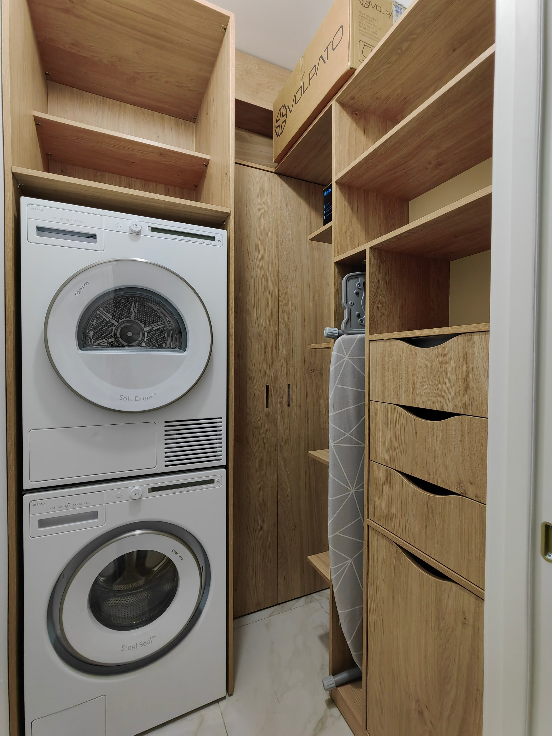 Встроенная система хранения для стиральной и сушильной машины. Такой подход особенно популярен в небольших квартирах или домах, где важно рационально использовать каждый метр