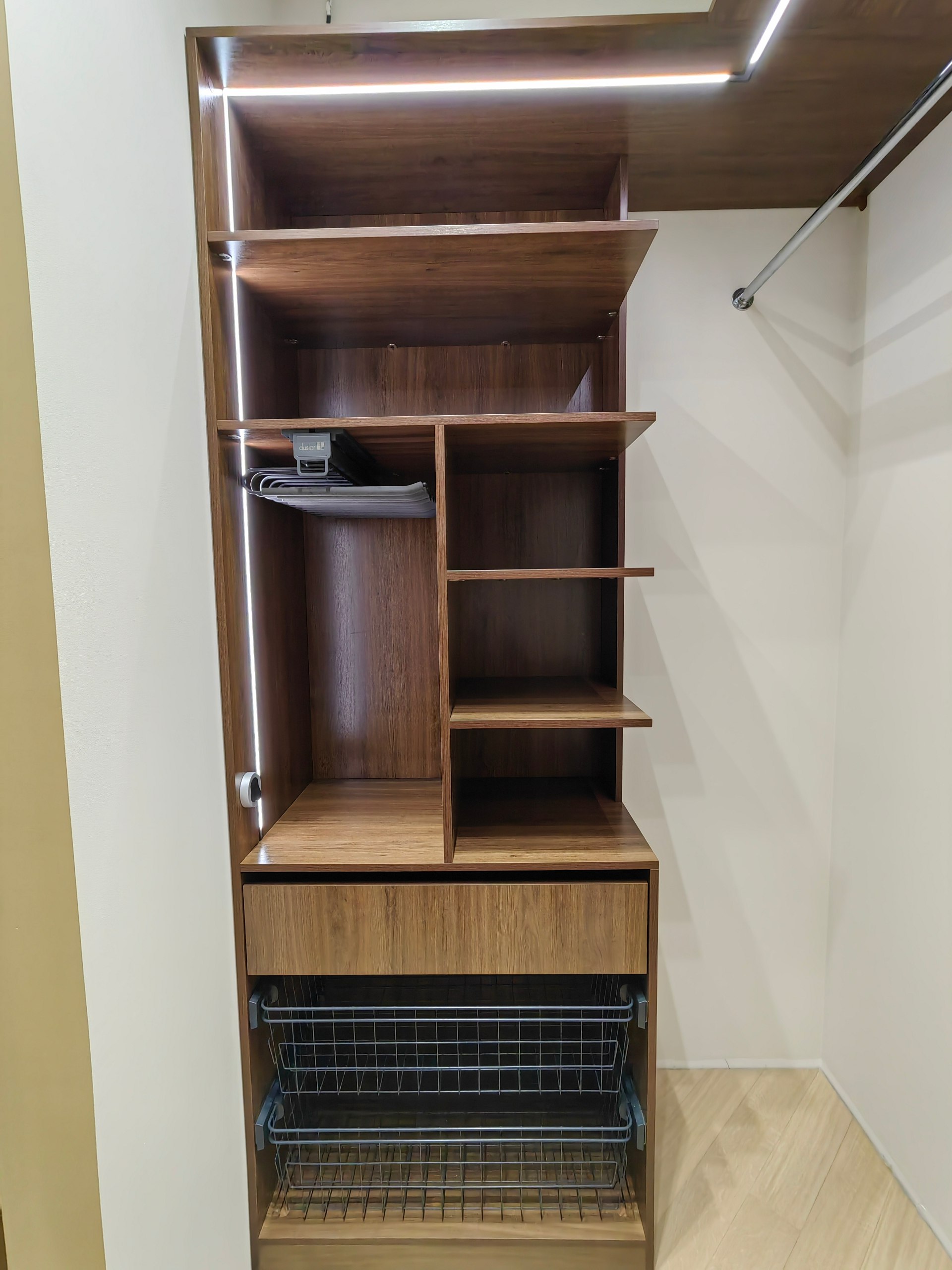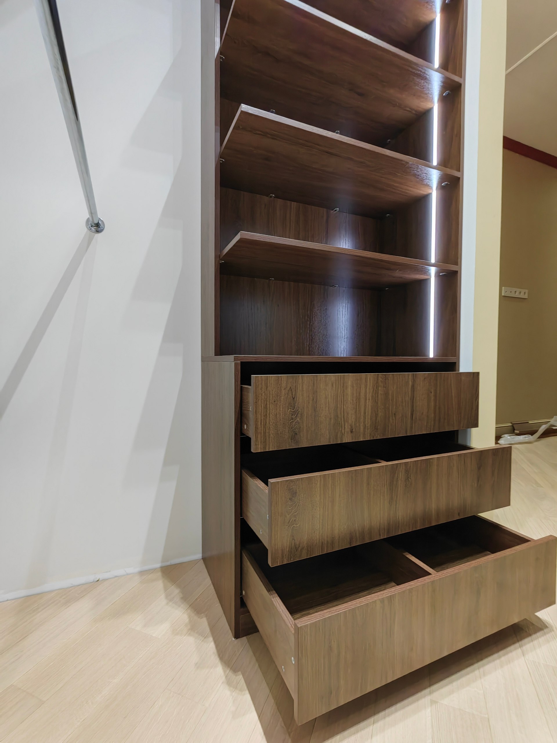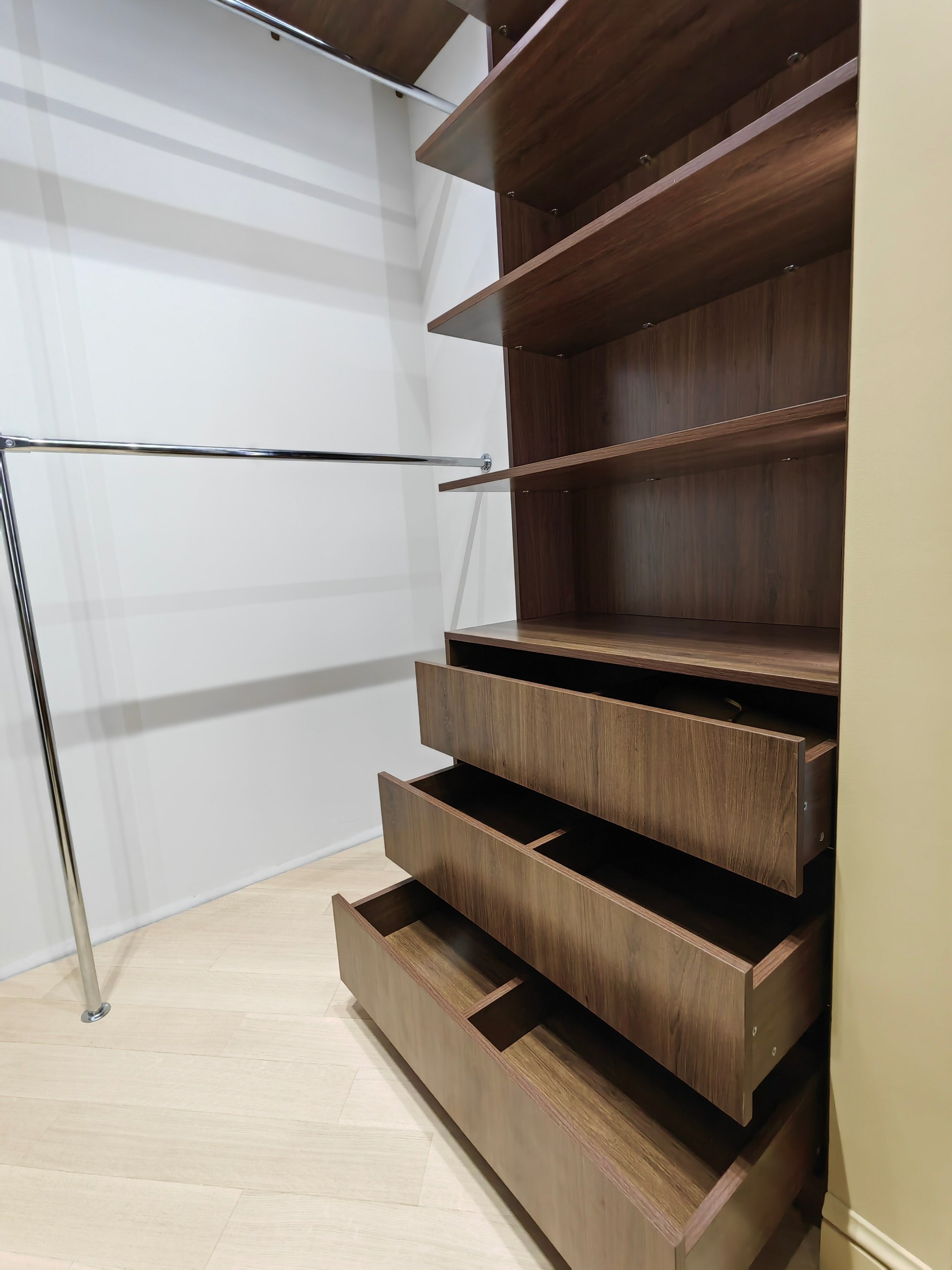 Корпусный шкаф или открытая система из МДФ-панелей, собранных в каркас. Может состоять из одной секции с штангой и парой полок