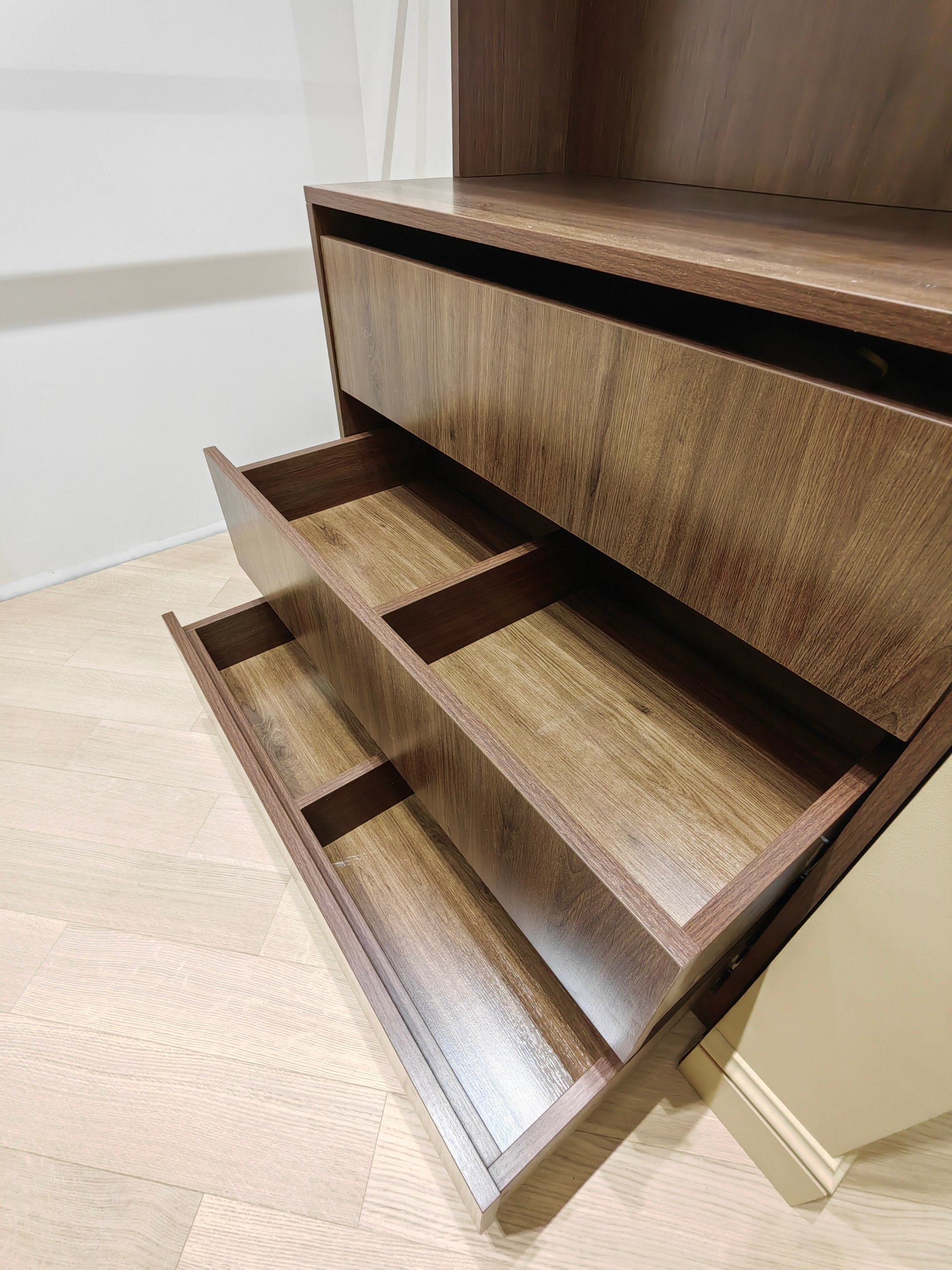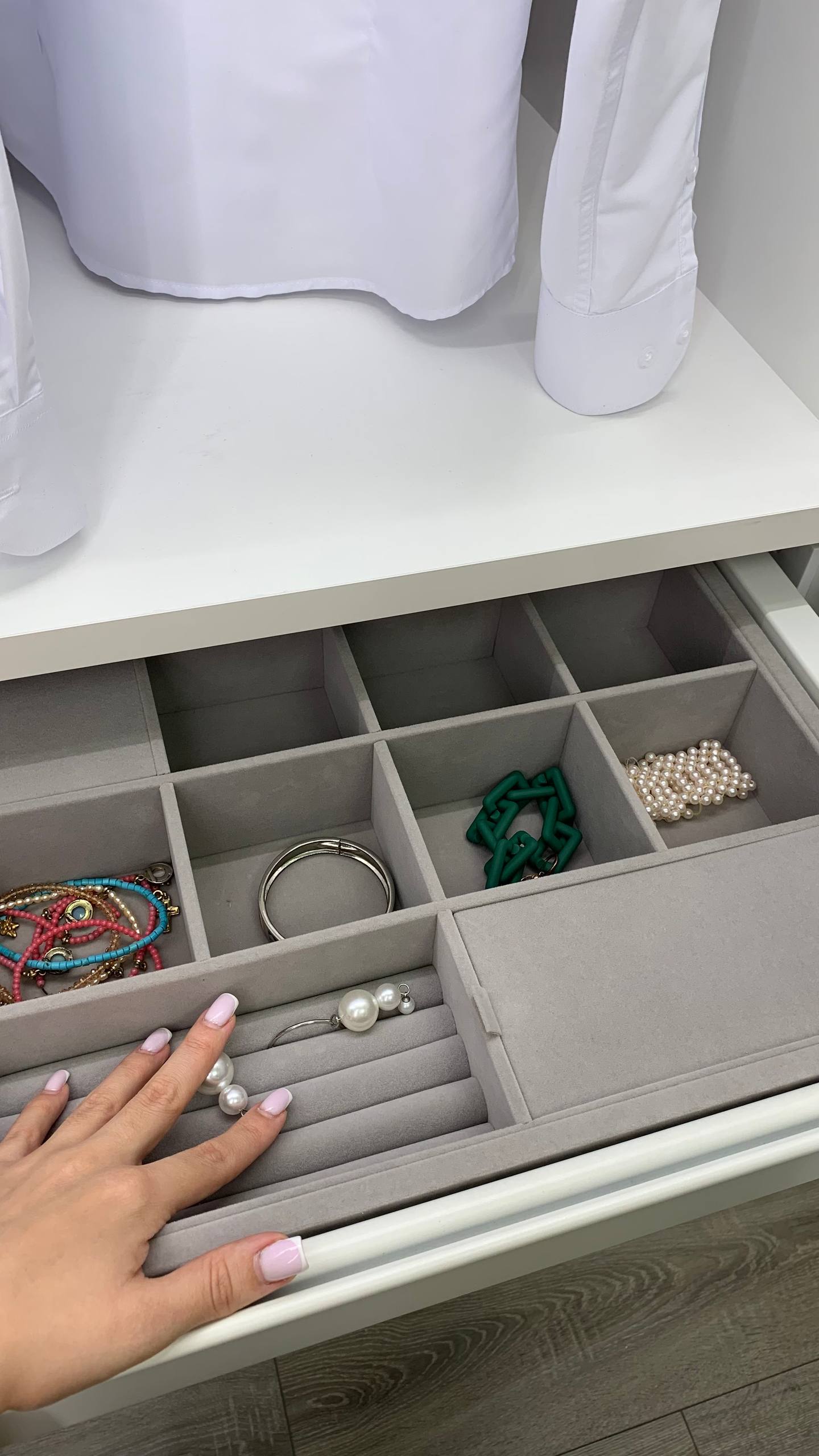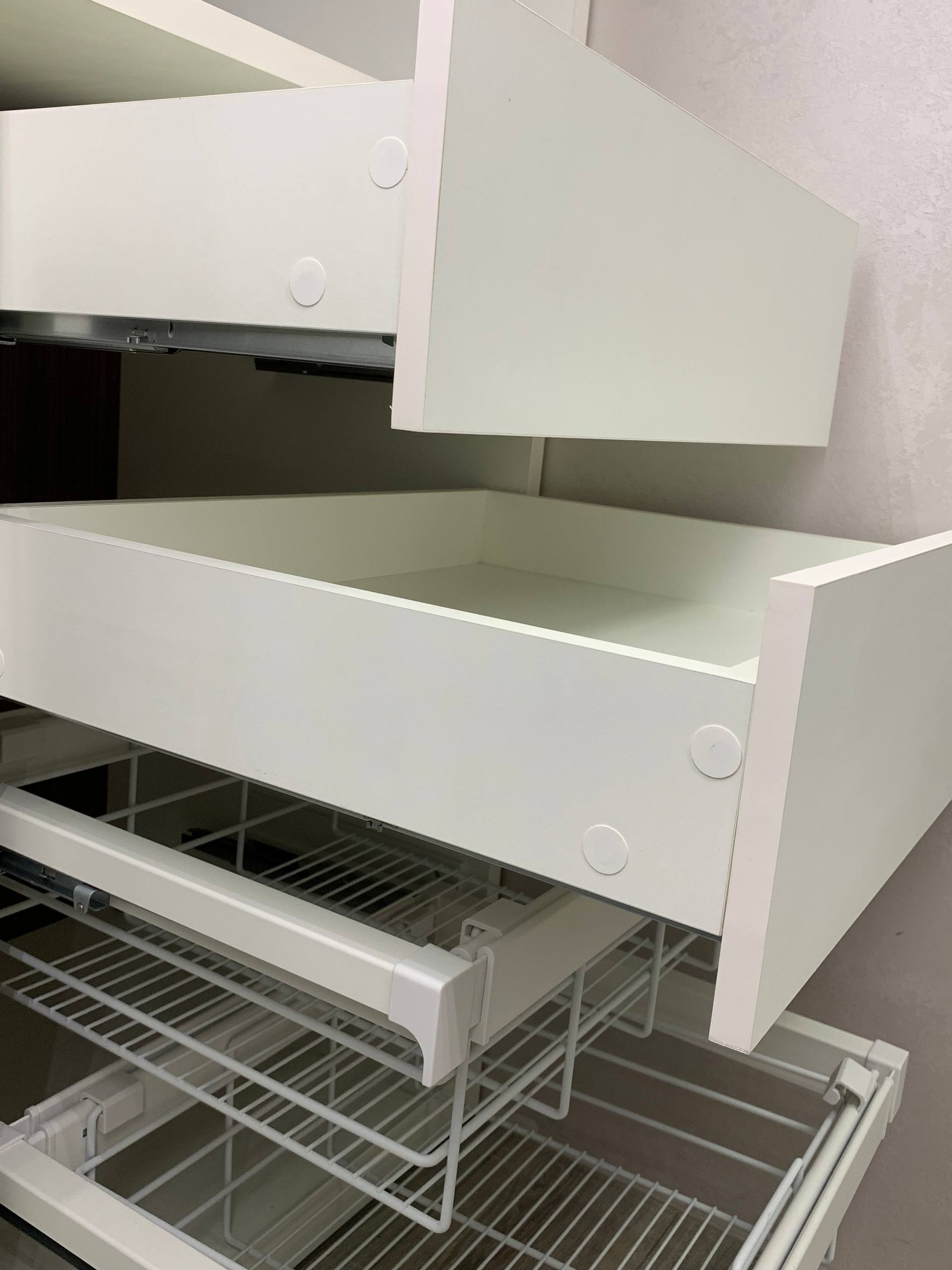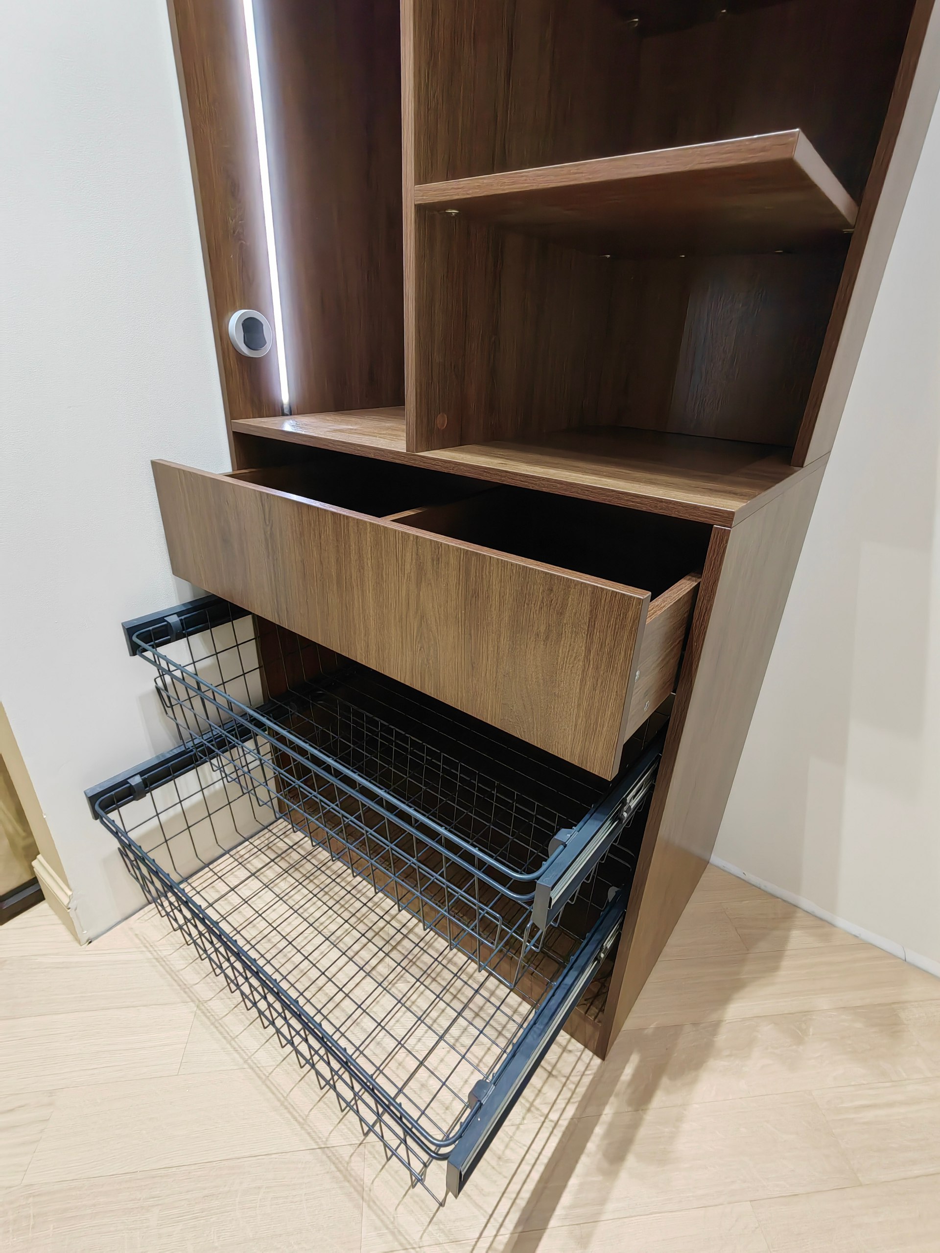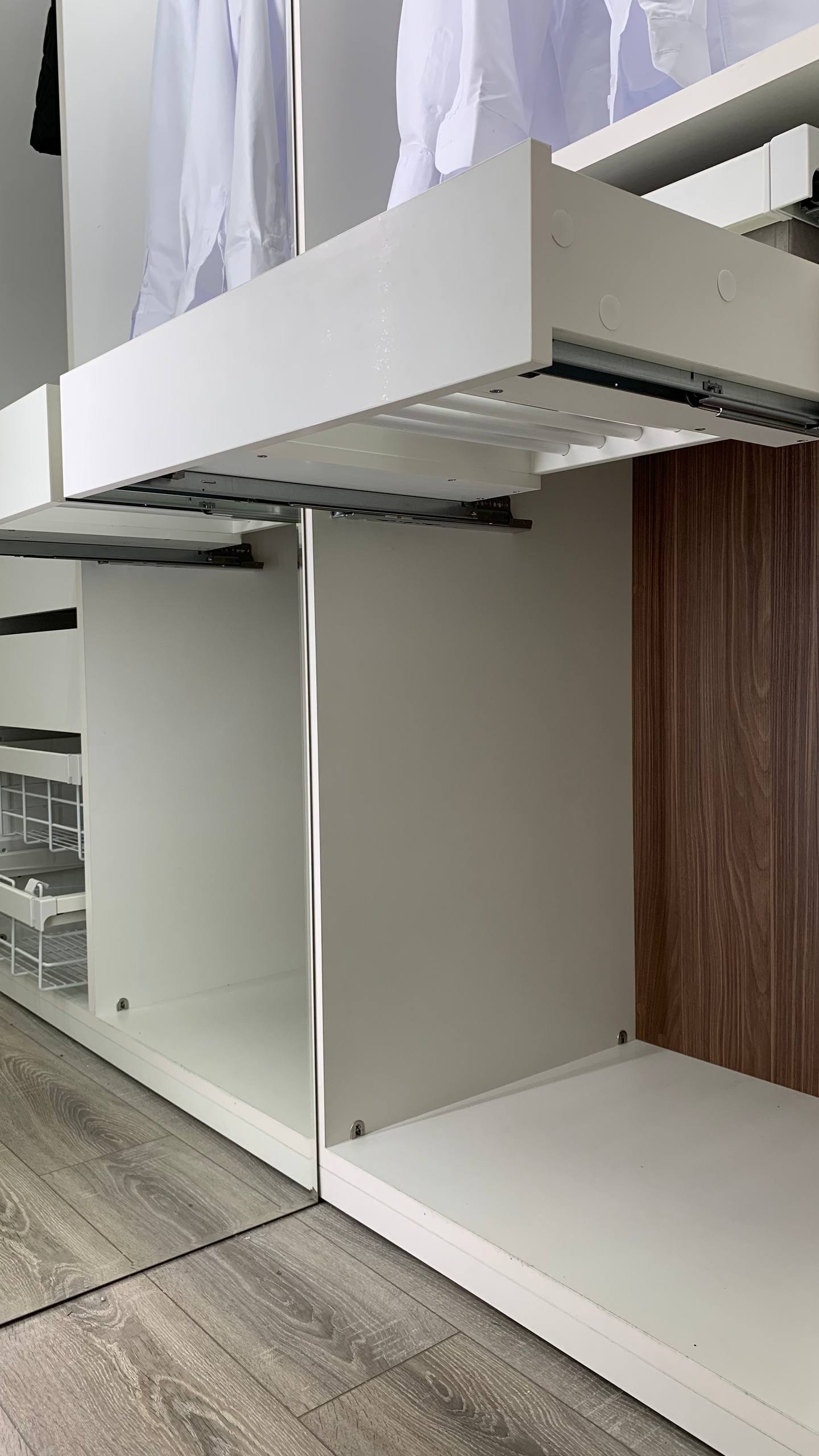 Maтepиaл фacaдa: внутренние элементы — полки, ящики, штанги — выполнены из МДФ с ламинированным или матовым покрытием в нейтральных тонах