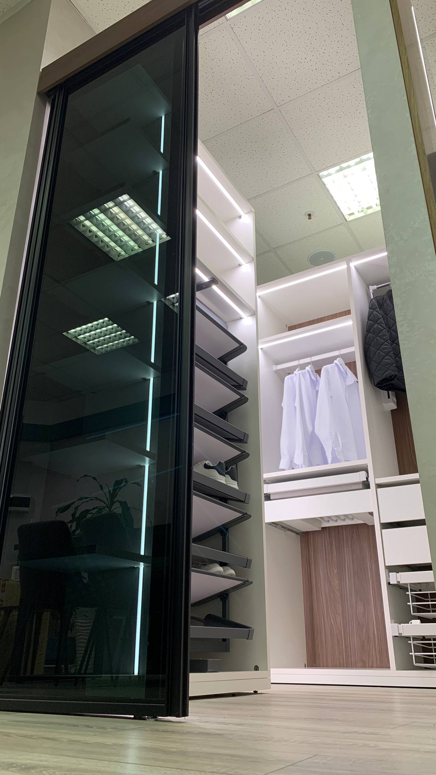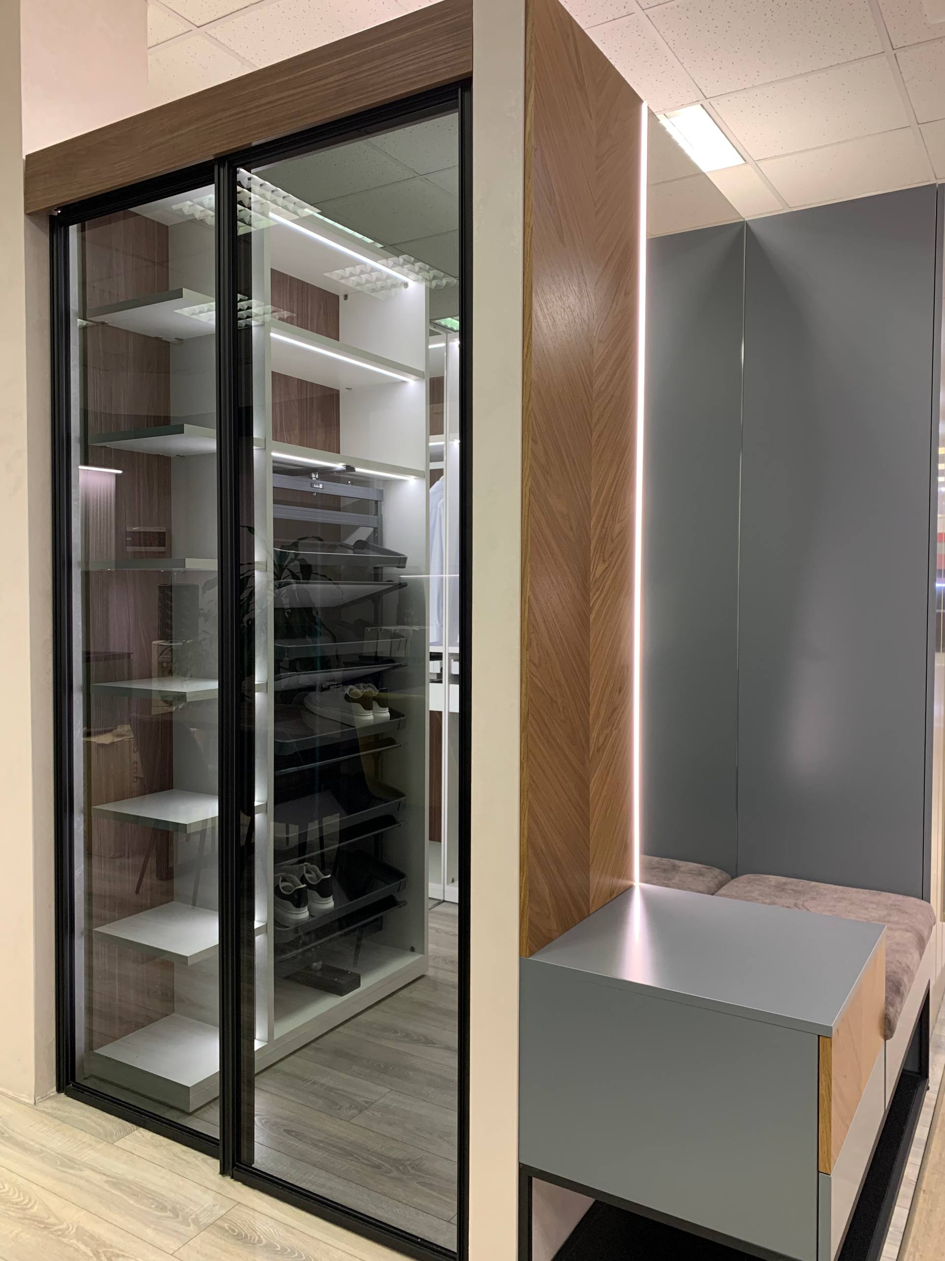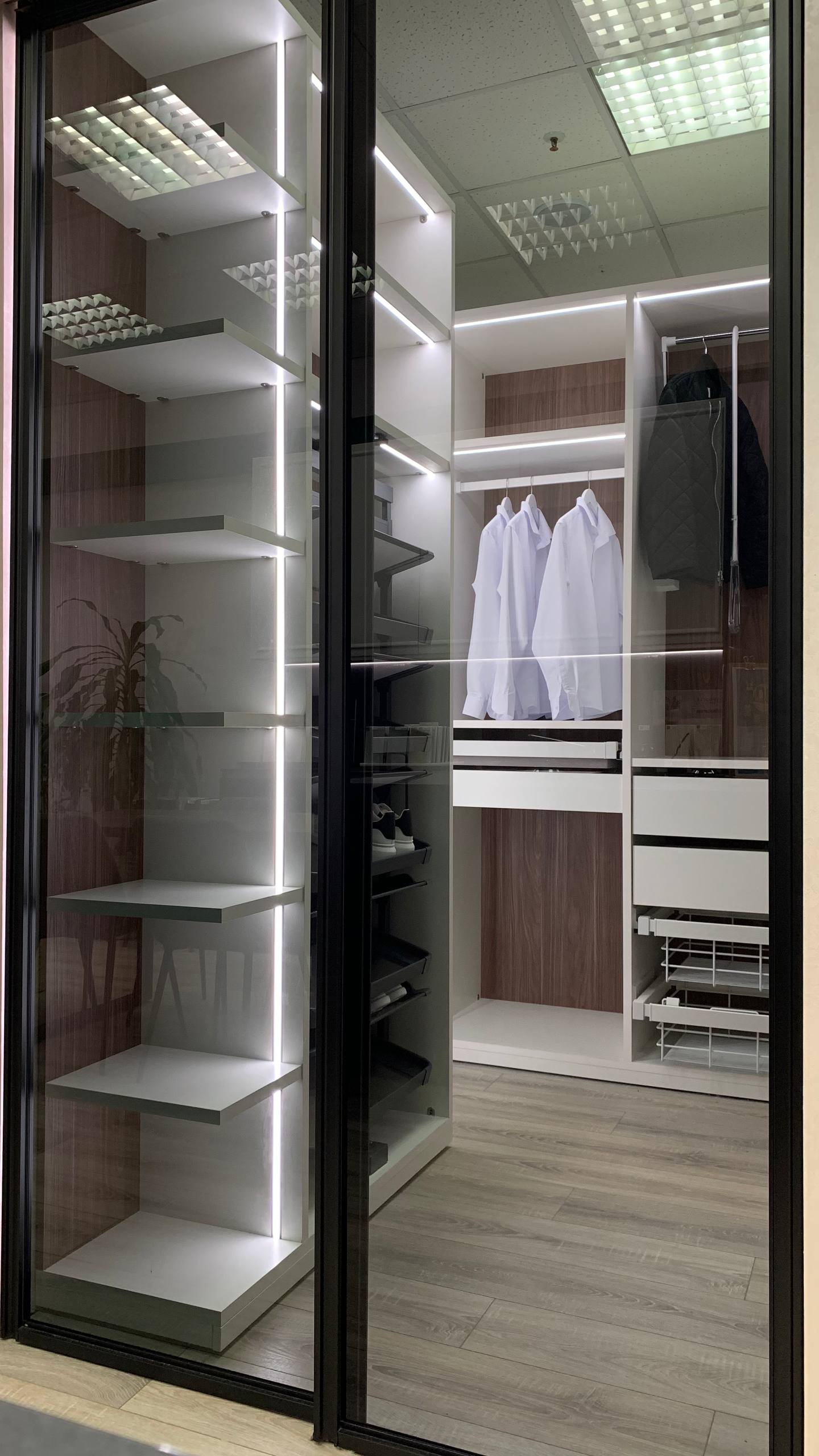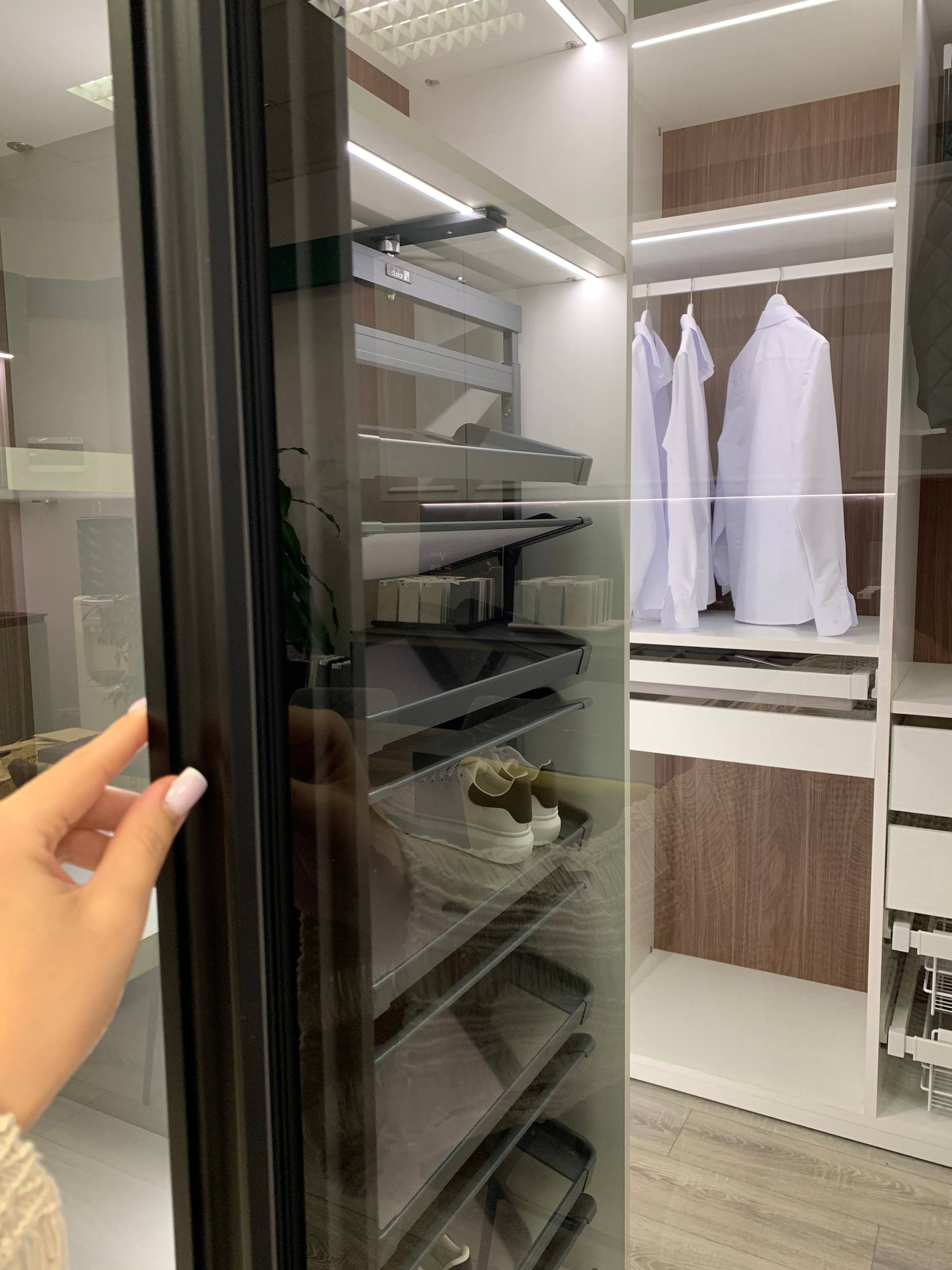 Стеклянные фасады не «давят» на пространство, даже если гардеробная занимает целую стену